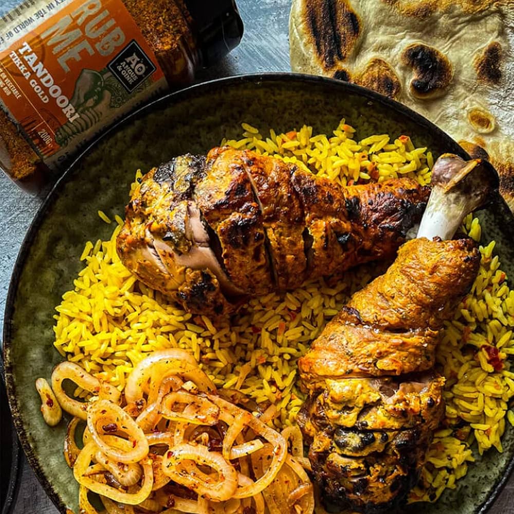 Skanu ant plėšyta aviena, suvyniota į chapatis su svogūnų salotomis ir granatų sėklomis. Tinka ir vištienai.